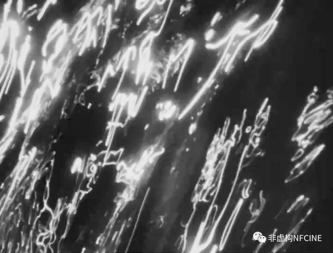 这种对水的多种形态的捕捉令人联想到伊文思(Joris Ivens)的杰作《雨》(Regen,1929),但Ralph Steiner的处理更为极简与形式主义,画面被简化为色块、线条与光影在不同外力作用下的波动、起伏或振荡。电子乐在这部电影中十分重要,它的加入则将波纹转化成了一种电子脉冲的意象,自然被去自然化了。在这个意义上,作品显示出了其吊诡的一点:它以一种极为传统的方式——正如导演在作品开头那段文字中所说:“本片不用任何花招(without any camera or lens tricks),人们只需凑近看便能看到(they are what anyone could see who looked closely)",使观者预见了未来数字时代的图案:在其中,音色、音量与节奏指挥并驱动着画面的波动构成。画面并非对自然的捕捉,而是纯粹的人工造物,是电子信号的产物。可以说电影以自然主义的方法预示了鲍德里亚意义上的拟真图像时代的到来。