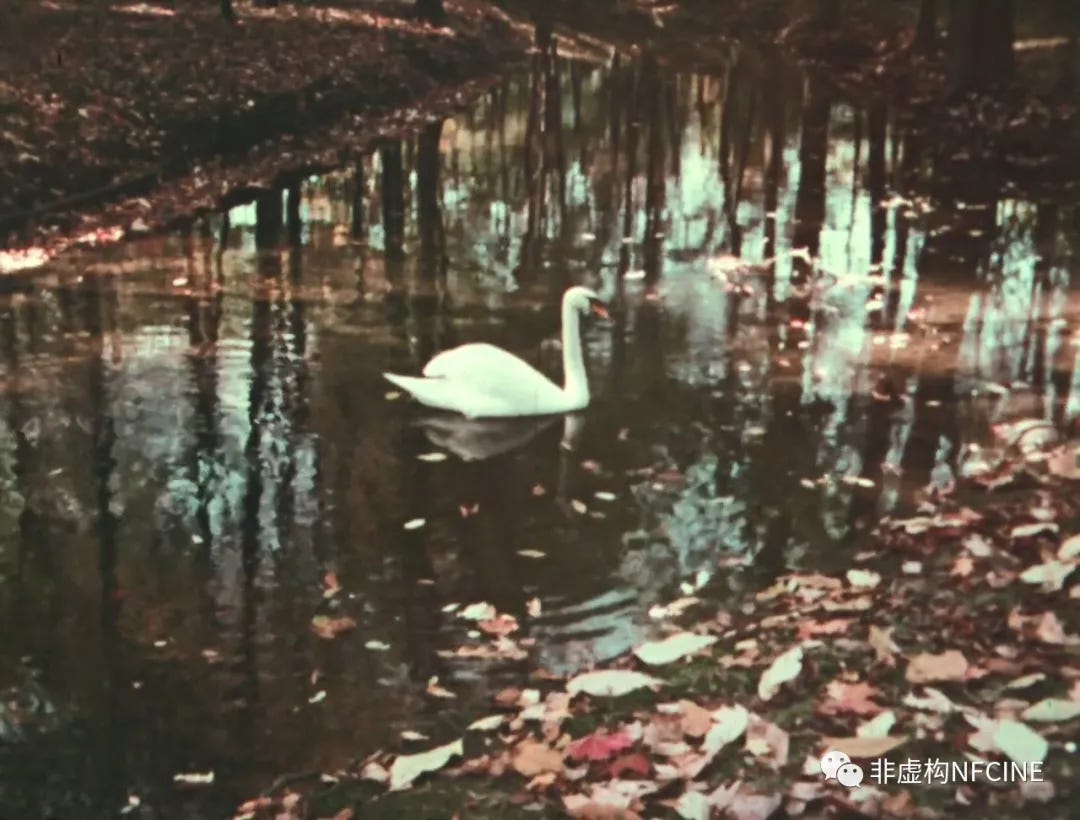让我们来举Look Park这部拍摄于1974年的作品中为例来谈谈他的典型风格。电影以法国十九世纪作曲家雅克·奥芬巴赫(Jacques Offenbach)充满田园气息的古典乐开场,用一系列中远景镜头交代了其所拍摄的公园场景:公园中山花烂漫,天鹅悠闲地在游着,绿色、红色与黄色的斑驳的树叶倒映在波光粼粼的湖面上。电影初段营造出一派宁静祥和的自然风光。然而三分钟之后,画风突变,电影画面由彩色变成黑白,景别由中远镜头转向特写,背景乐则由古典转向电子(由作曲家Jacob Druckman所做),聚焦于光线、观看角度与水流速度的不同对湖水视觉效果的复杂影响。特写、黑白画面与电子乐的出现改变了湖水的性质,令画面突然由写实转向了抽象。